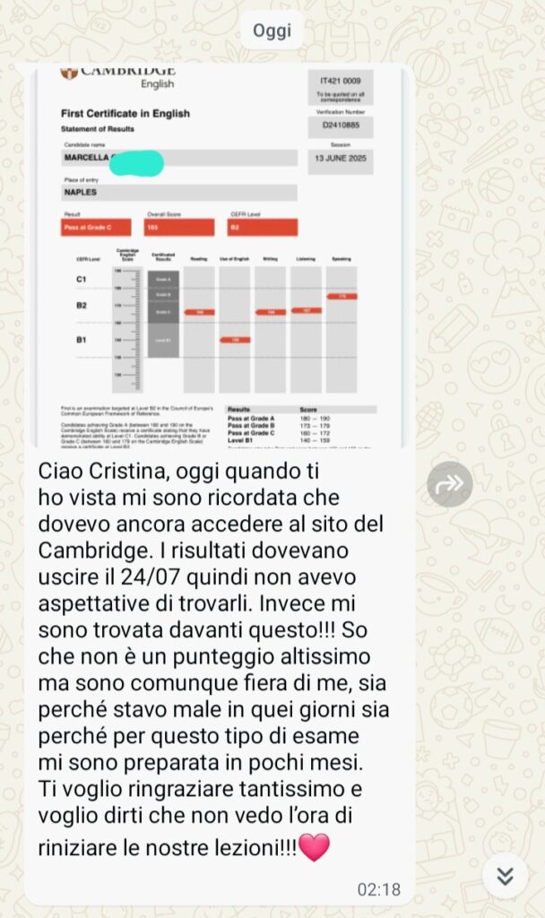 I’m Cristina, a certified English and French teacher with 10 years of experience. I help students gain confidence in English while preparing for Cambridge certificates (A2–C1).